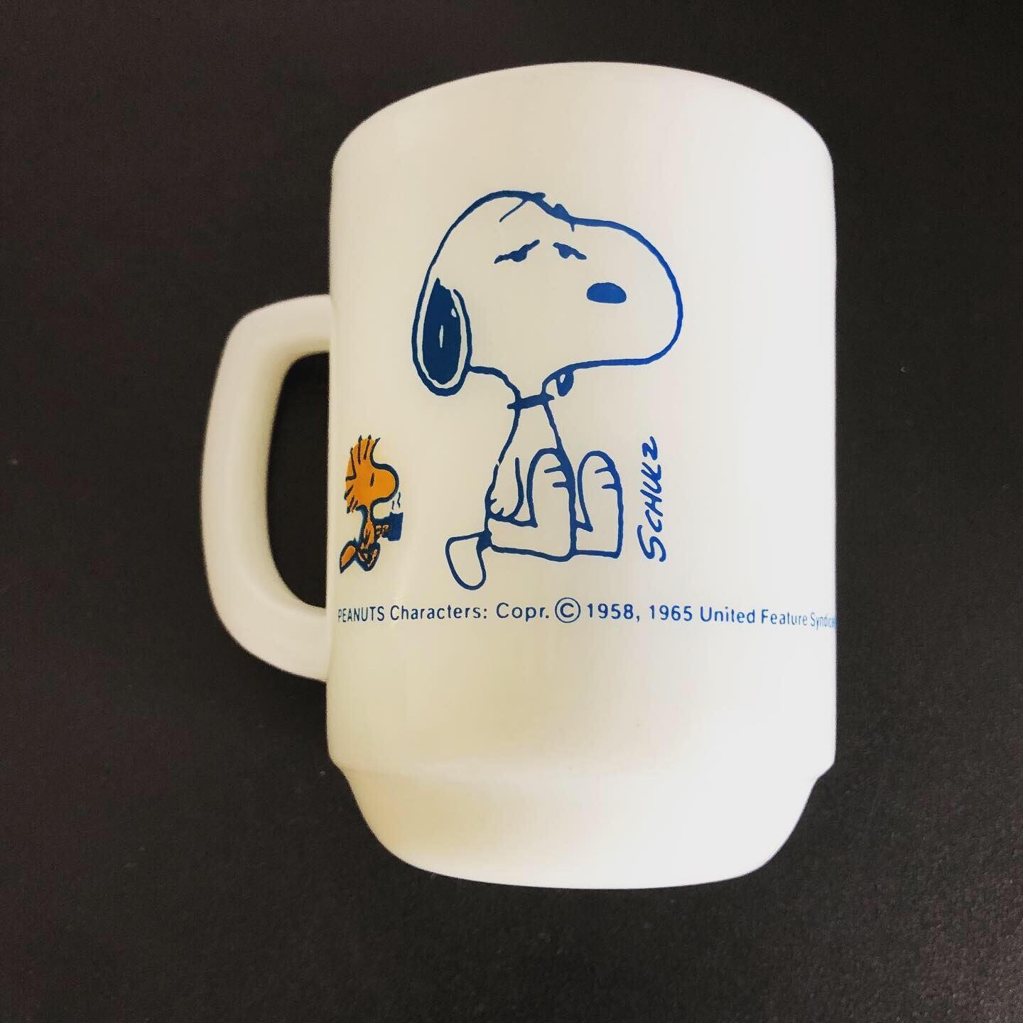 Fire King ファイヤーキングのミルクグラス スヌーピーマグです。大変綺麗な状態で、使用された形跡はありません。欠けやチップはありません。