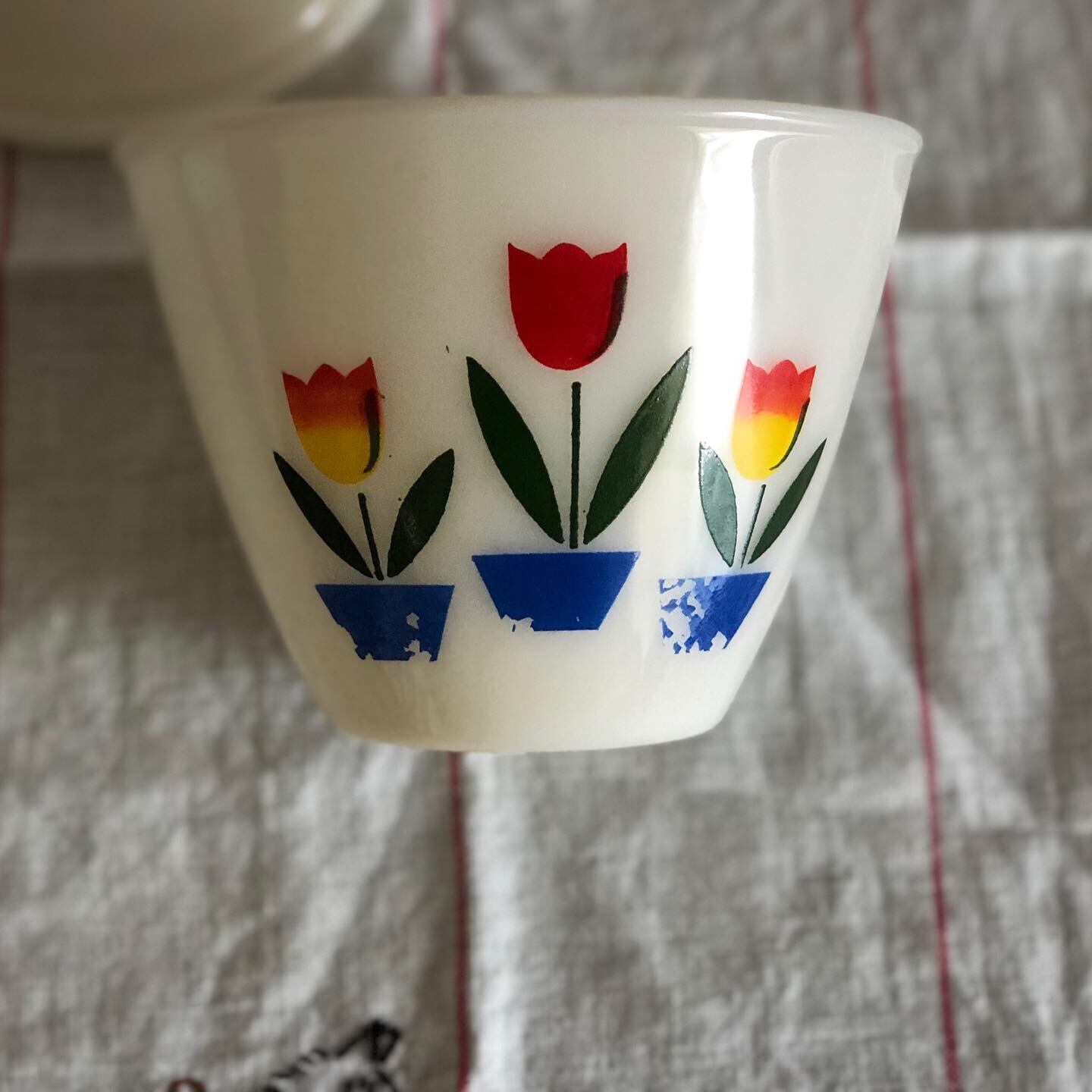 Fire Kingファイヤーキングのアイボリー チューリップ柄のグリースジャーです。大変綺麗な状態で、使用された形跡はありません。欠けやチップはありませんが、ペイントロスが片方のチューリップの青い鉢にあります。目立たないガラスの剥げがあります。(写真でご確認ください)