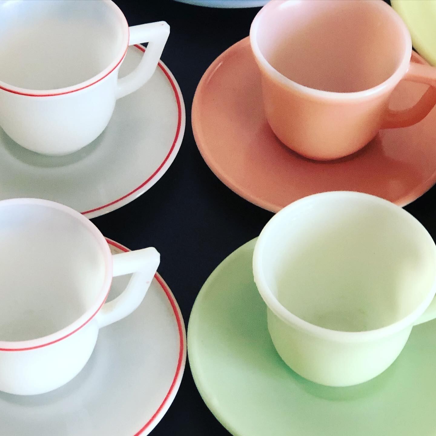 Hazel-Atlas ヘーゼルアトラスのミルクグラス リトルホステスシリーズのカップ&ソーサーとケーキ皿、おまけで人気のピンク色のクリーマーをおつけします。大変綺麗な状態で、使用された形跡はありません。欠けやチップなどありません。色の剥げもなく、大変よいコンディションです。バラ売りもいたします。お問い合わせください。