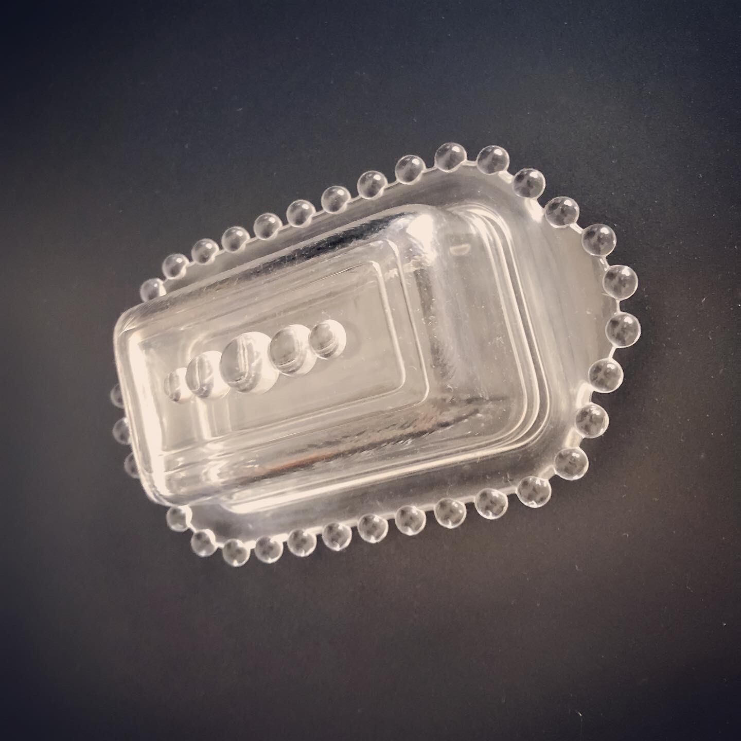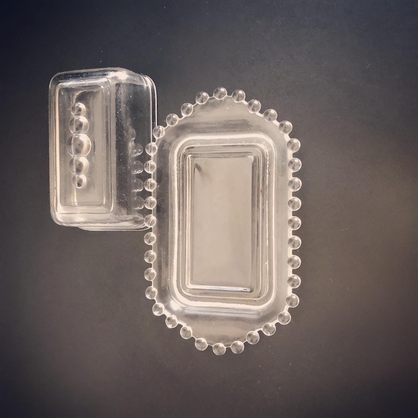 キャンドルウィックのバターディッシュです。サイズは大きめです。欠けやひびなどなく使用感のない美しいお品です。製造時よりあるガラスのムラ、スレなどはあります。気泡がみられます。
