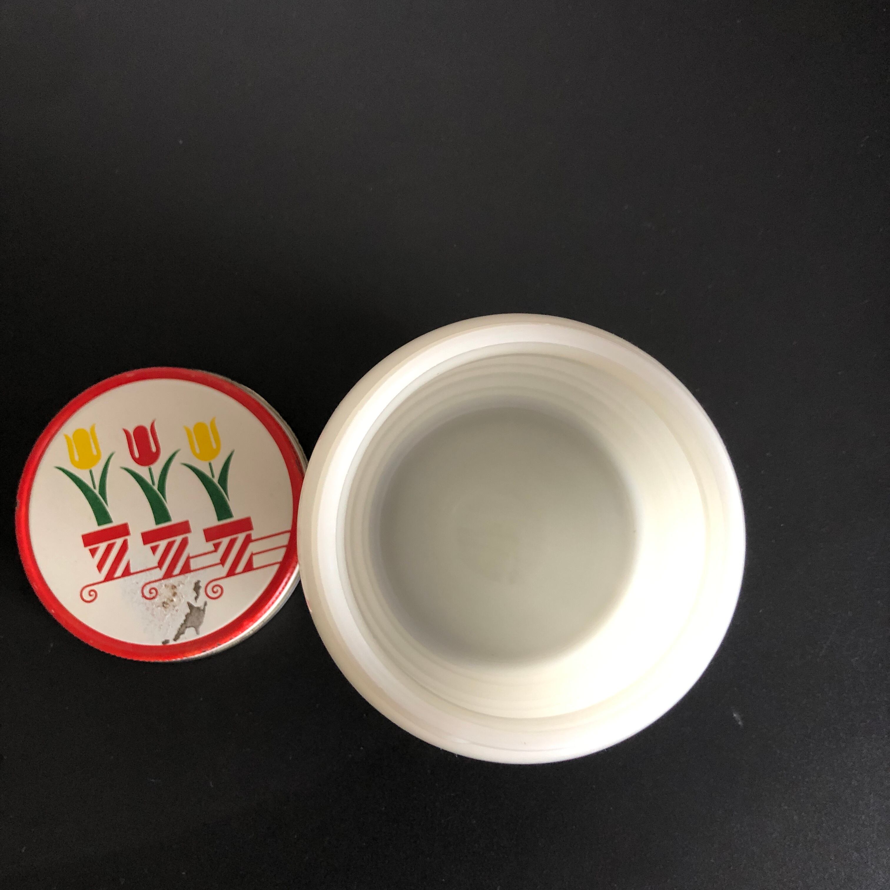 Fire Kingファイヤーキングのアイボリー チューリップ柄のグリースジャーです。