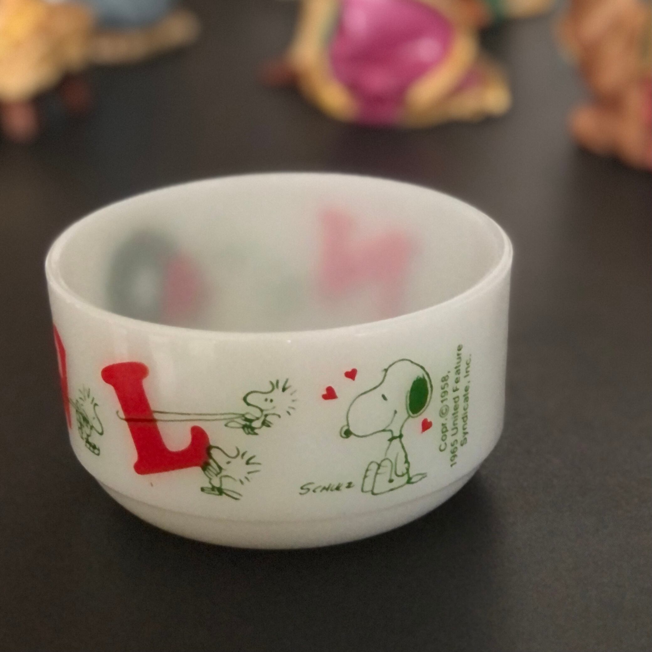 ファイヤーキングの大人気のスヌーピー柄のクリスマス仕様 ノエルボウルです。Fire King Snoopy Noel Bowl ファイヤーキングらしいミルクグラスの上のやさしい絵柄です。